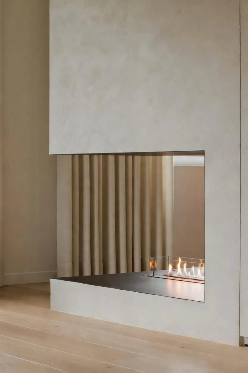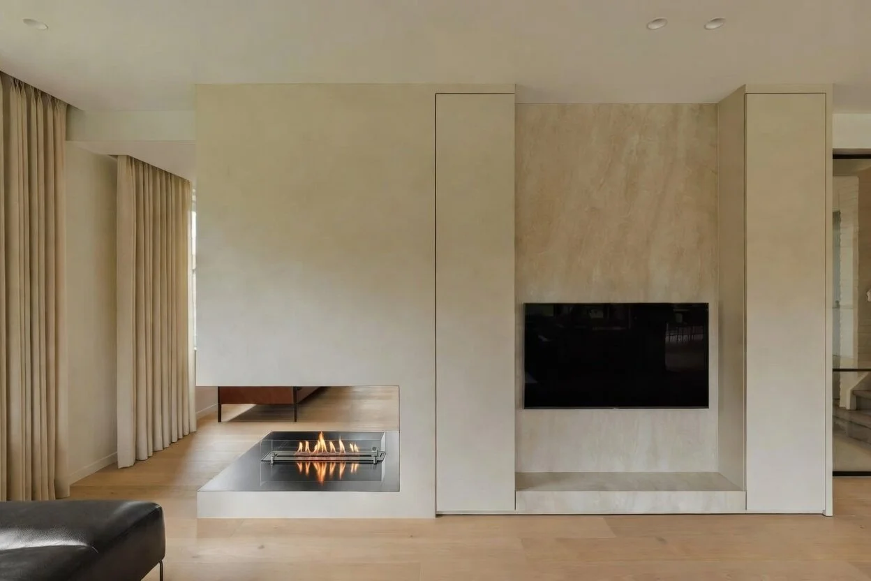 De absolute blikvanger van het interieur is zonder twijfel de roomdivider met bio-haard. Dit architecturaal element vormt het warme hart van de woning en creëert tegelijk een subtiele scheiding tussen de verschillende leef zones, zonder het open karakter van de ruimtes te verliezen. Het zachte vlammenspel zorgt vanuit meerdere hoeken in de woning voor een bijzondere sfeer en maakt van elke plek een aangename plaats om te vertoeven.