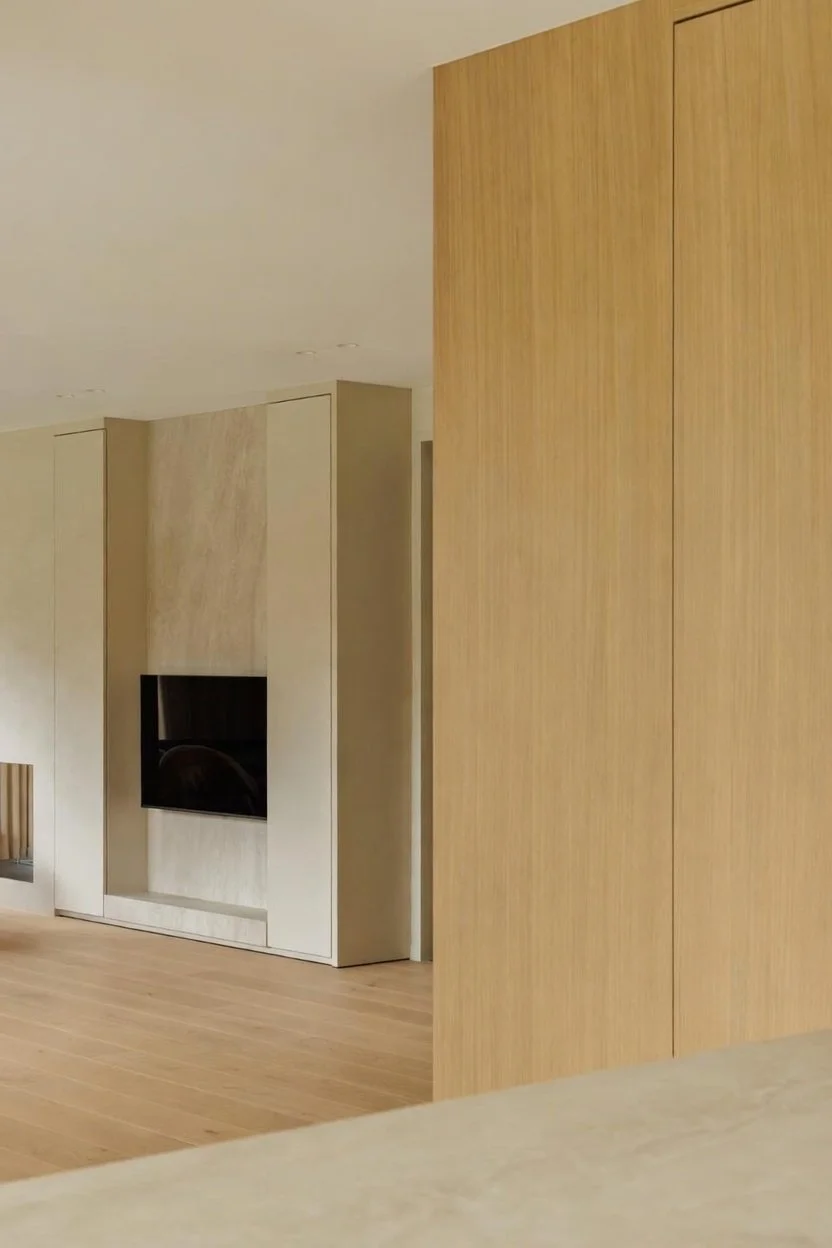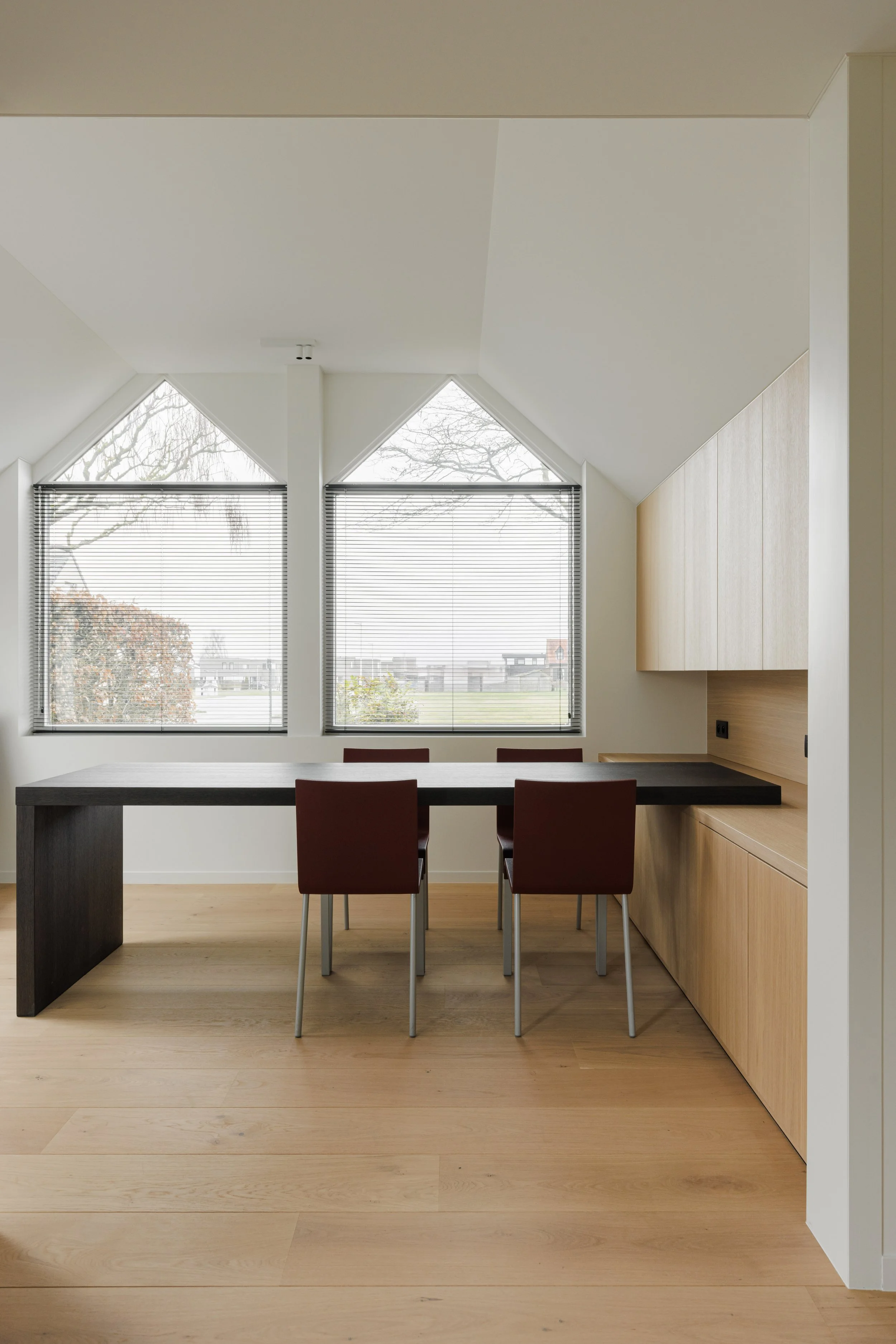 Een belangrijk uitgangspunt in het ontwerp was het creëren van een sterke ruimtelijke samenhang tussen bureel, living en keuken. Door doordachte zichtlijnen, subtiele licht-accenten en zorgvuldig uitgewerkt maatwerk vloeien deze ruimtes vandaag moeiteloos in elkaar over. Het maatwerk meubilair loopt als een rode draad doorheen de woning en verbindt de verschillende leefruimtes tot één coherent en harmonieus geheel.