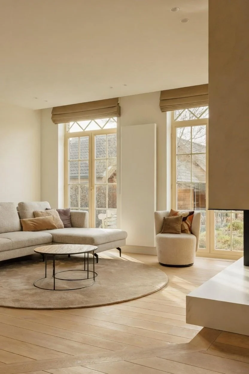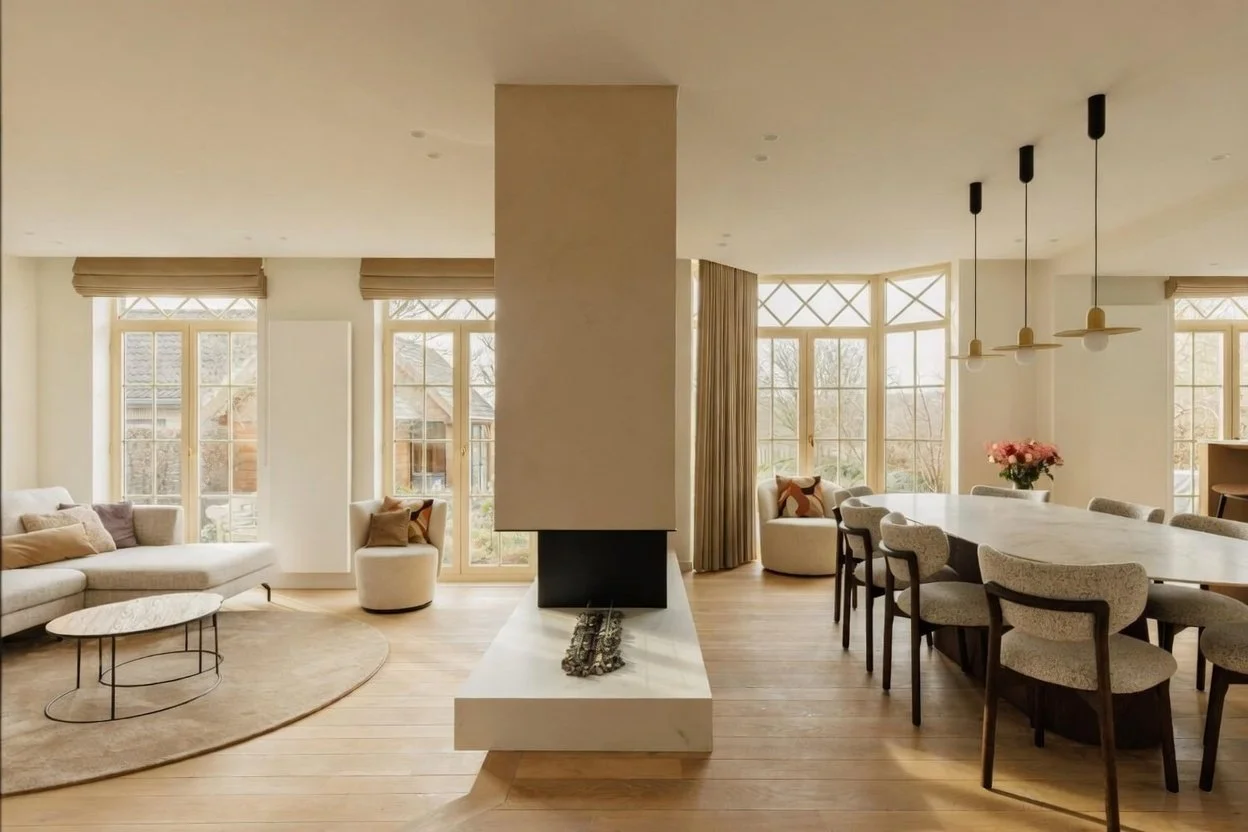 De vroegere aparte leefruimte en keuken werden samengebracht tot één doordachte en harmonieuze ruimte. De zitruimte wordt subtiel afgescheiden van de eetkamer door een “roomdivider” met ingewerkte bio-haard, volledig afgewerkt in Aqua-sensa, een uitzonderlijke materie die warmte, zachtheid en karakter brengt in het interieur.
