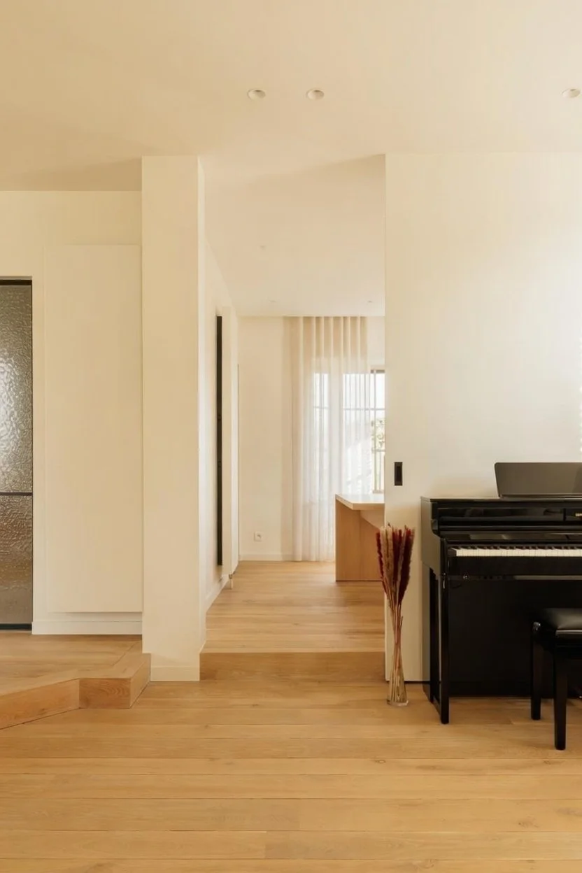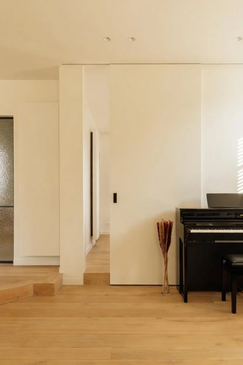 Het bureel werd op een slimme manier verbonden met de leefruimte door een kamerhoge schuifdeur. Zo valt er meer daglicht binnen en ontstaat een aangename werkplek die tegelijk geïntegreerd aanvoelt met de rest van de woning. Opvallend zijn ook de prachtige staaldeuren, die het licht door de volledige woning laten stromen en de ruimtes op elegante wijze met elkaar verbinden.